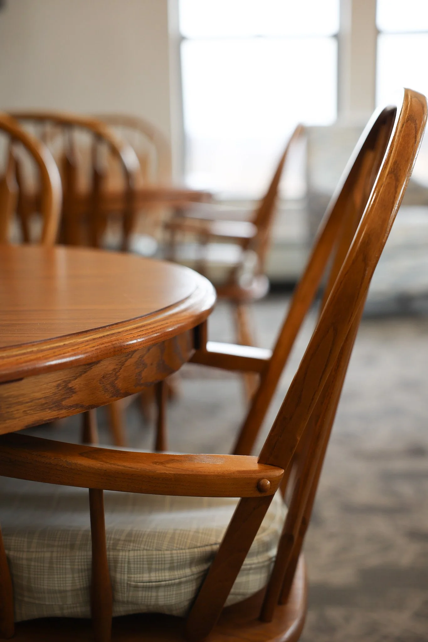 A group of elderly women playing a game of Mahjong at a round table in a bright room with large windows and a potted plant. View fullsize