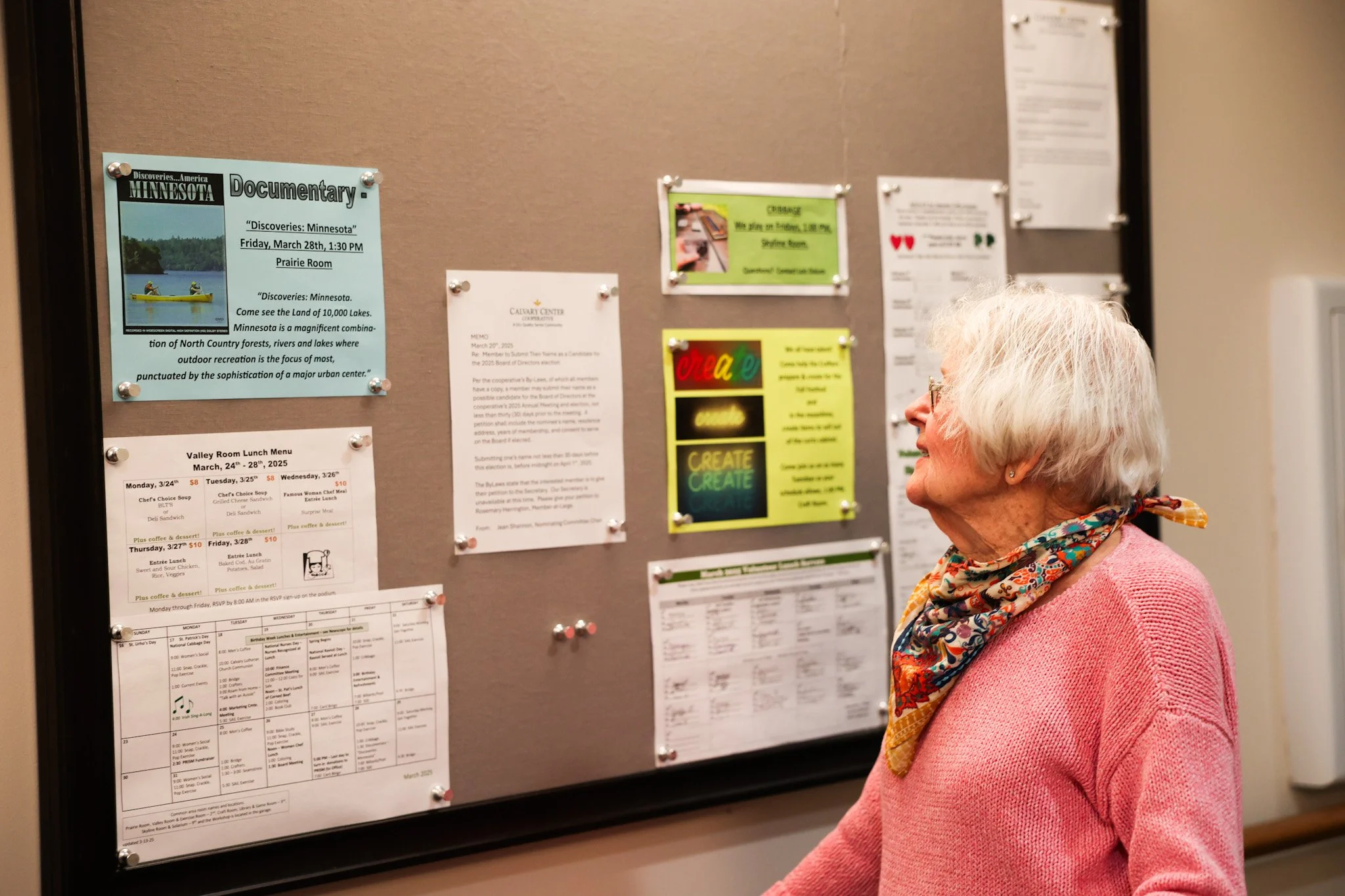 An elderly woman with white hair and glasses looking at a bulletin board filled with various notices, schedules, and flyers. She is wearing a pink sweater and a colorful scarf.