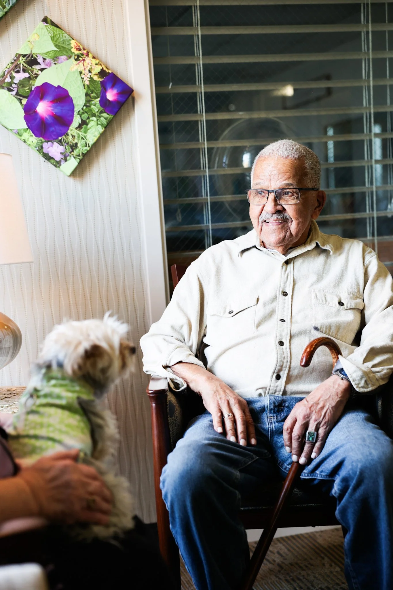 An elderly man with glasses, a beige shirt, and jeans sitting in a chair holding a wooden cane, smiling. A person with a ring is holding a small dog wearing a green sweater. There is floral artwork on the wall behind them.